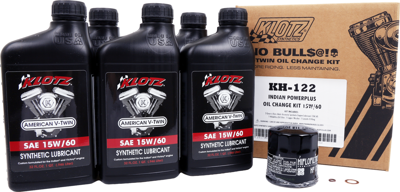 Click the button below to add the Klotz 5Qt Synthetic Oil Change Kit for Indian Powerplus KH-122 to your wish list.