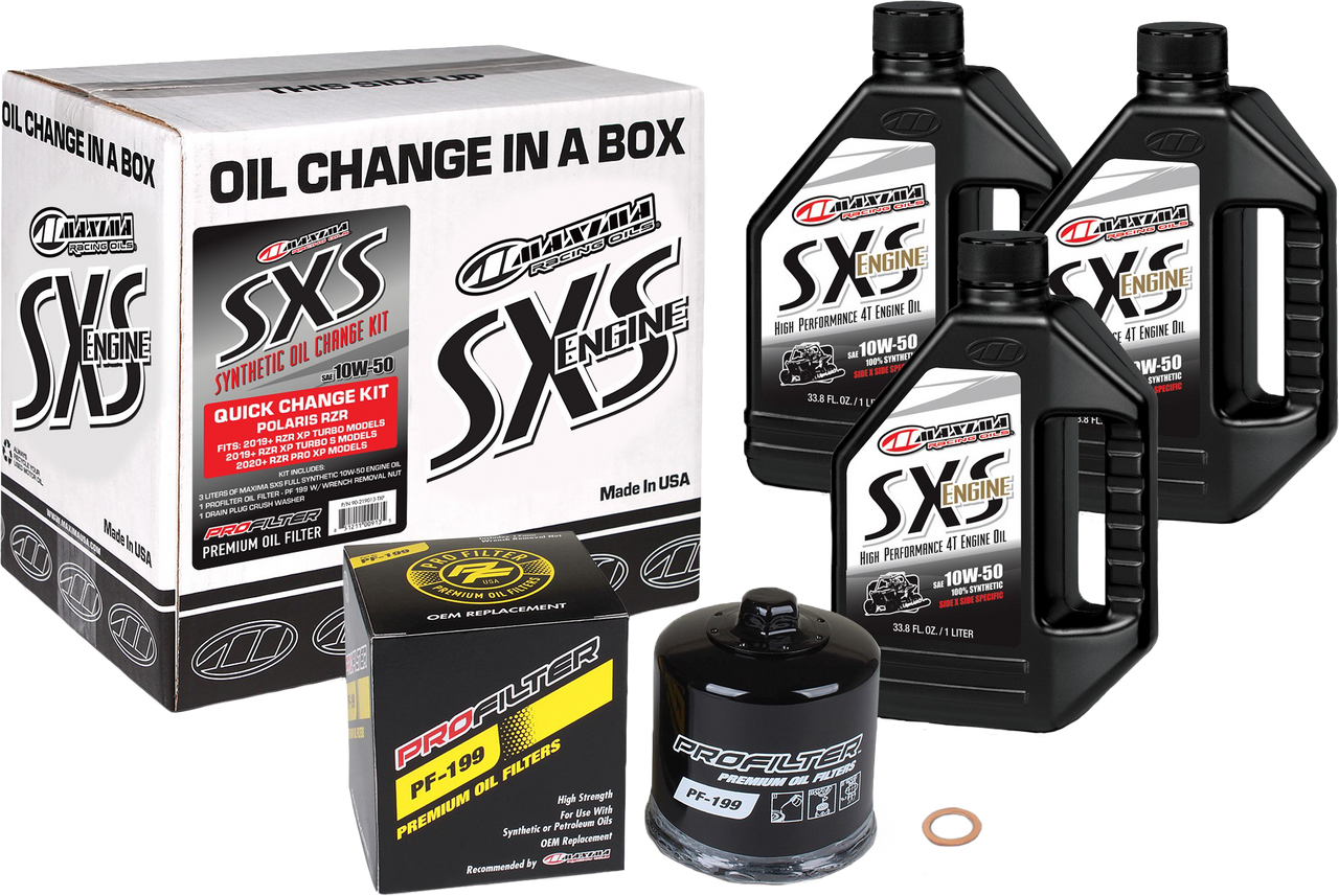 Polaris RZR Turbo Quick Change Kit includes all products necessary to complete an oil change on your Polaris RZR Turbo Side-by-Side. 3 liters of Maxima SXS Full Synthetic 10W-50 engine oil, ProFilter Premium Spin-On Oil Filter with wrench removal nut (PF-199) and drain plug crush washer. Meets or exceeds all manufacturers' specifications and will not void your new vehicle warranty.
