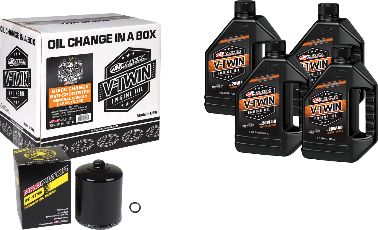 Click the button below to add the Maxima V-Twin Oil Change Kit Evo Mineral Black Filer 90-069014PB to your wish list.